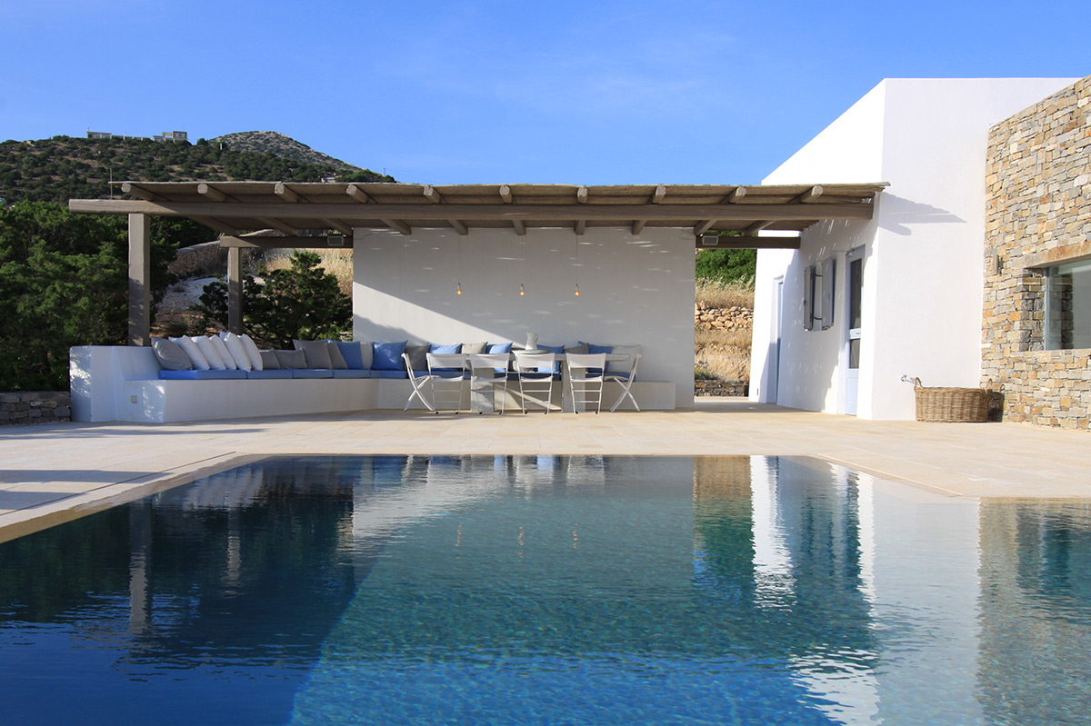 Set in one of the most privileged locations of southern Paros, villa Agassi is a gorgeous six bedroom summer home with striking views of the bay of Faragas and a breathtaking sunset. True to the vernacular architecture, the structure is composed of strict geometric forms, clean lines and dazzling white surfaces that create an interesting contrast with the soothing colors of the sea and sky.