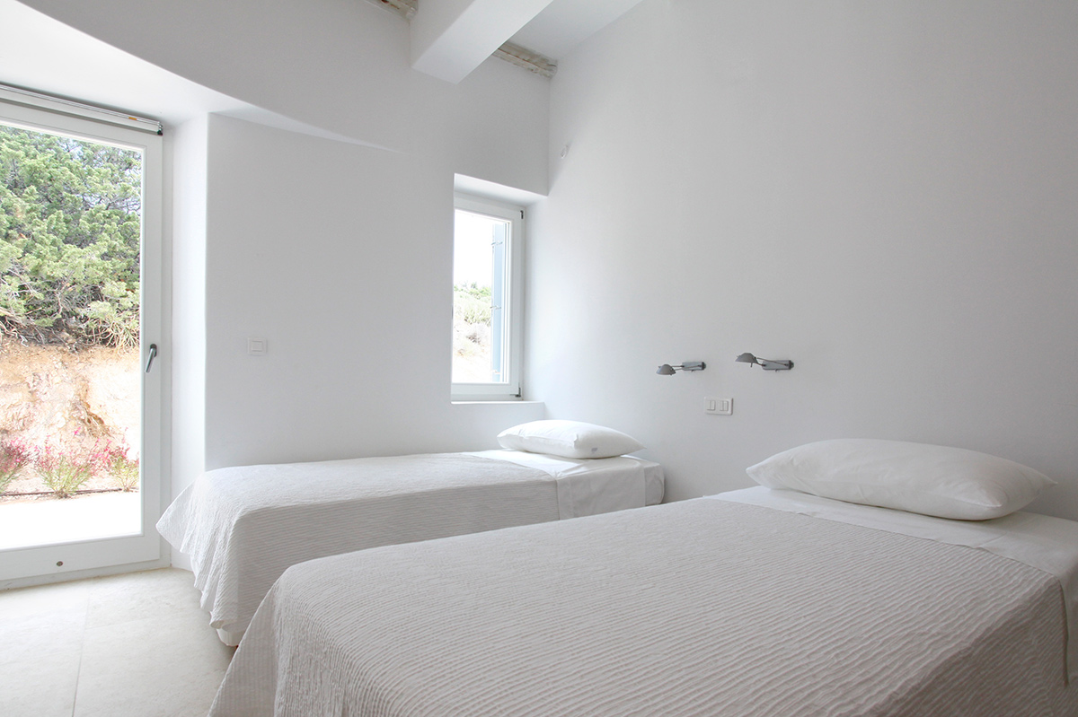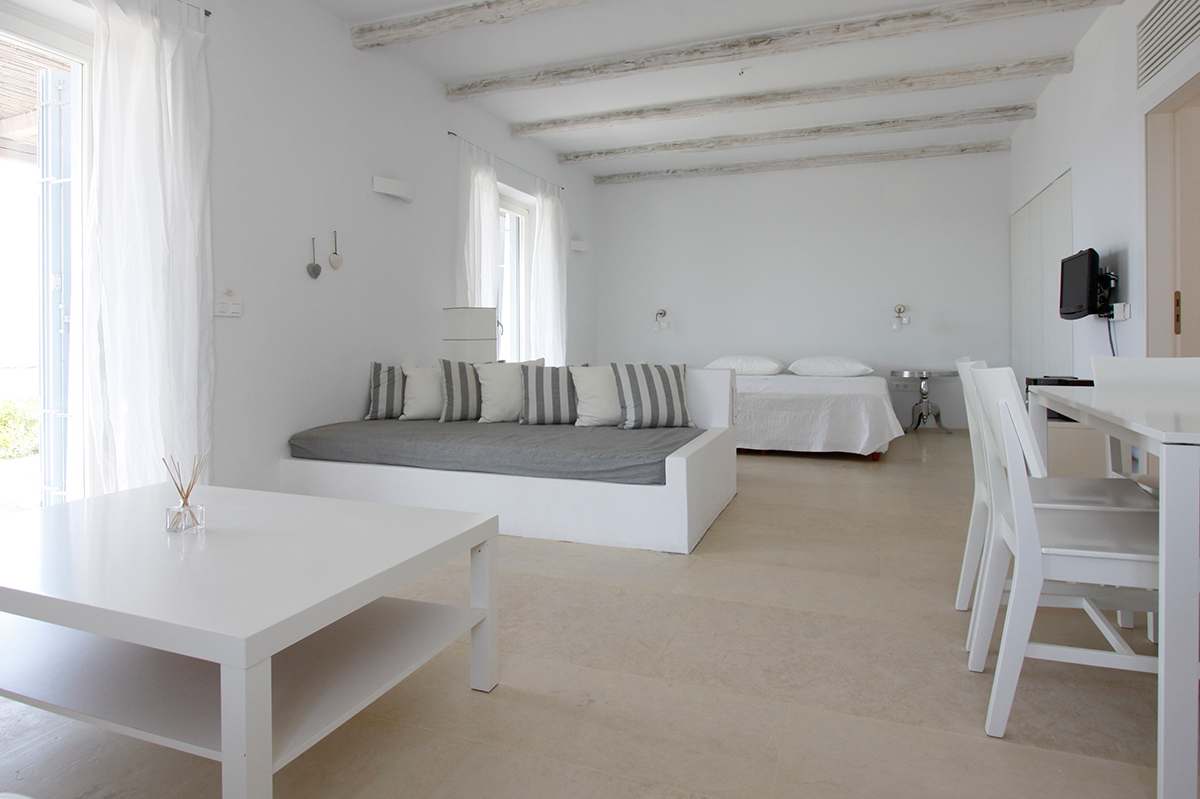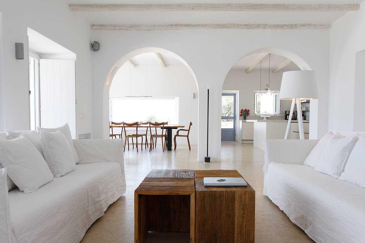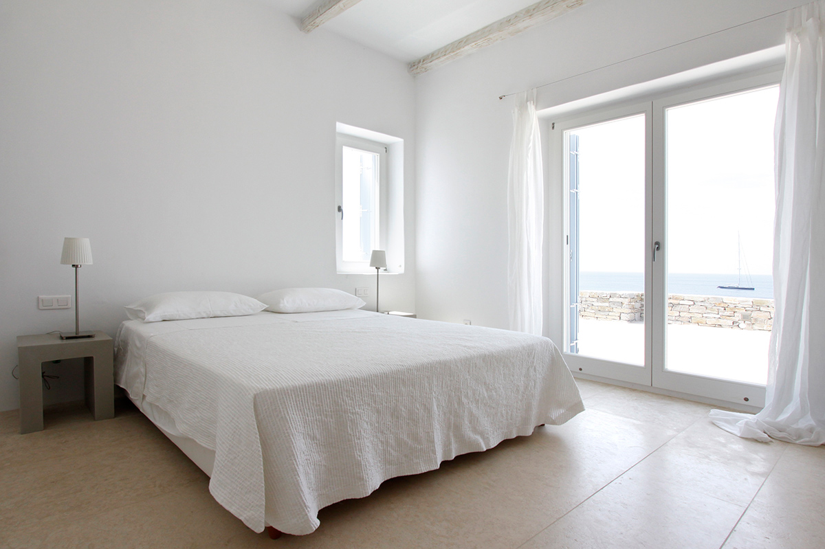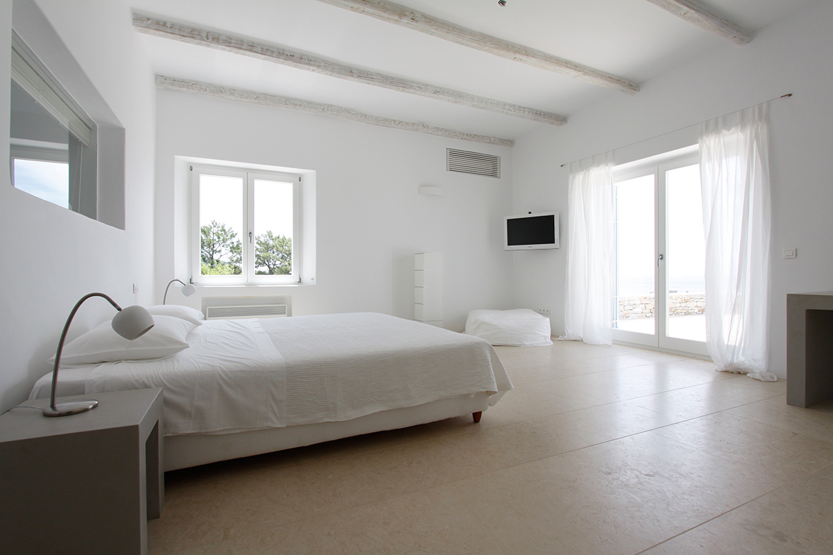 There is minimum usage of furniture and accessories, while great emphasis has been laid on spaciousness. The living room, kitchen and dining area are divided by high arches that add a geometric slant and optimize the illusion of openness. Orientated to offer views of the sea, the comfortable sofas and raw-wood coffee table are highlighted by the pale-colored polished stone floorings. The designer raw-wood dining table is served by a stylish kitchen that is fully equipped for home-cooking. In the same concept, the bedrooms are large and inviting, with designer furnishings and carefully selected upholstery aimed to pamper our senses and create an atmosphere of ultimate relaxation. All bedrooms lead to gorgeous verandas and offer stunning views of the settings. There are also two independent guest houses that are accordingly decorated and are ideal for couples or guests.