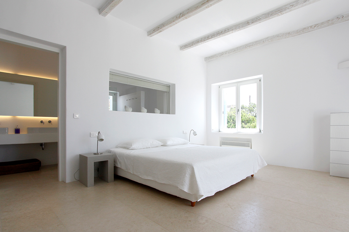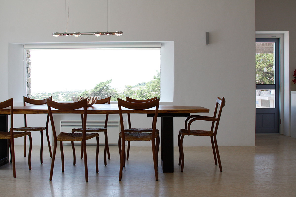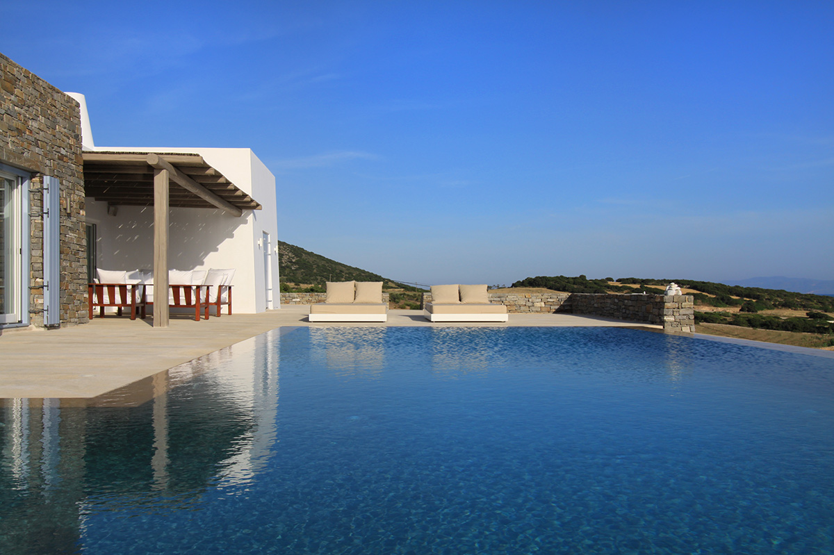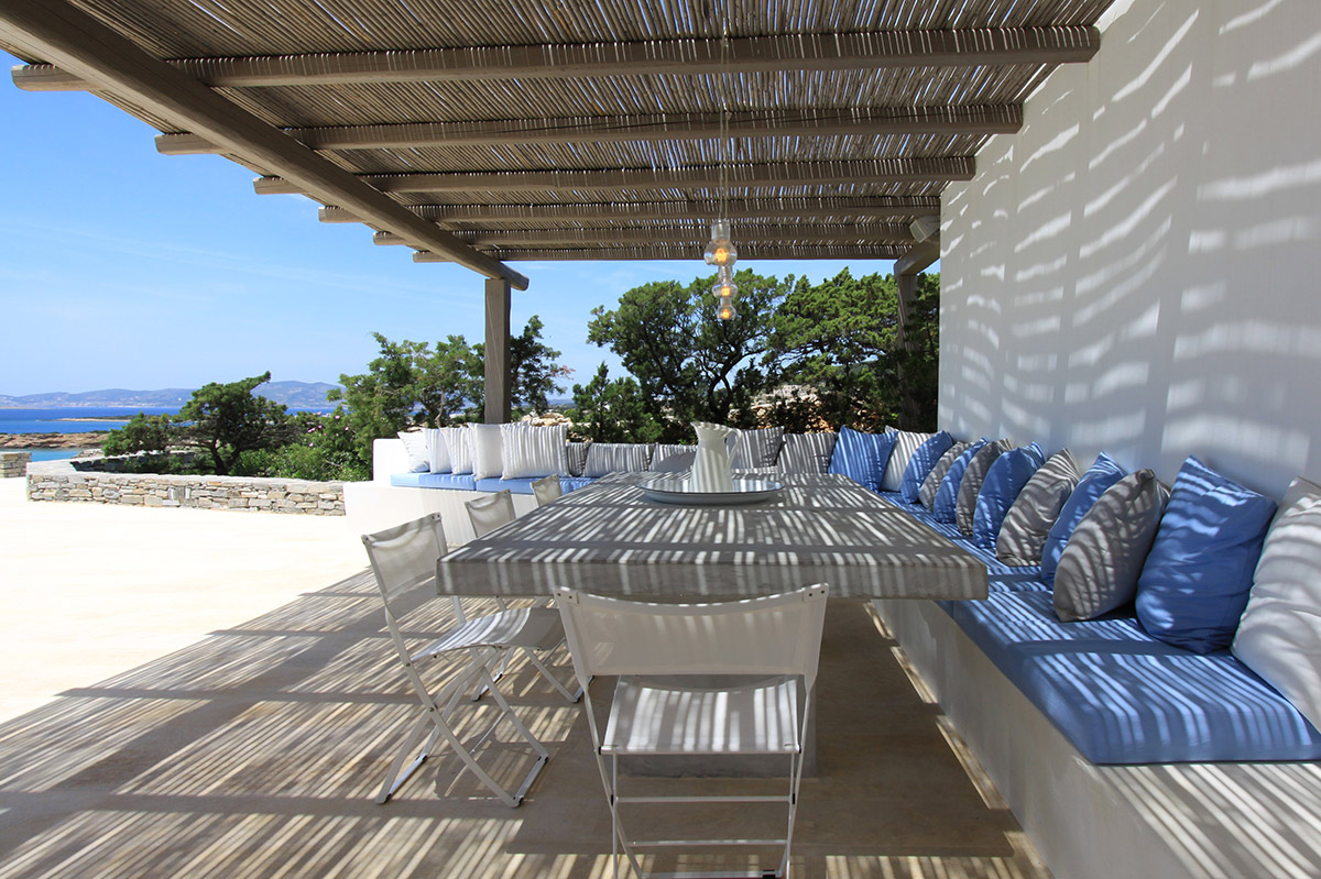 There is minimum usage of furniture and accessories, while great emphasis has been laid on spaciousness. The living room, kitchen and dining area are divided by high arches that add a geometric slant and optimize the illusion of openness. Orientated to offer views of the sea, the comfortable sofas and raw-wood coffee table are highlighted by the pale-colored polished stone floorings. The designer raw-wood dining table is served by a stylish kitchen that is fully equipped for home-cooking. In the same concept, the bedrooms are large and inviting, with designer furnishings and carefully selected upholstery aimed to pamper our senses and create an atmosphere of ultimate relaxation. All bedrooms lead to gorgeous verandas and offer stunning views of the settings. There are also two independent guest houses that are accordingly decorated and are ideal for couples or guests.
