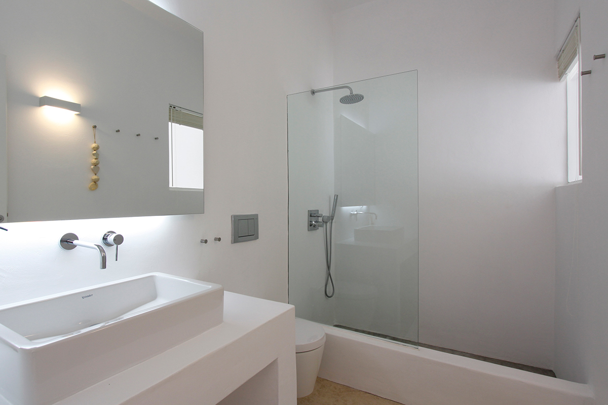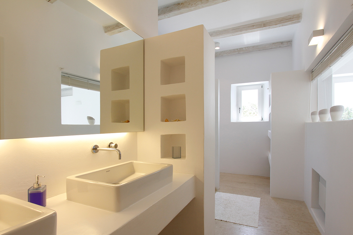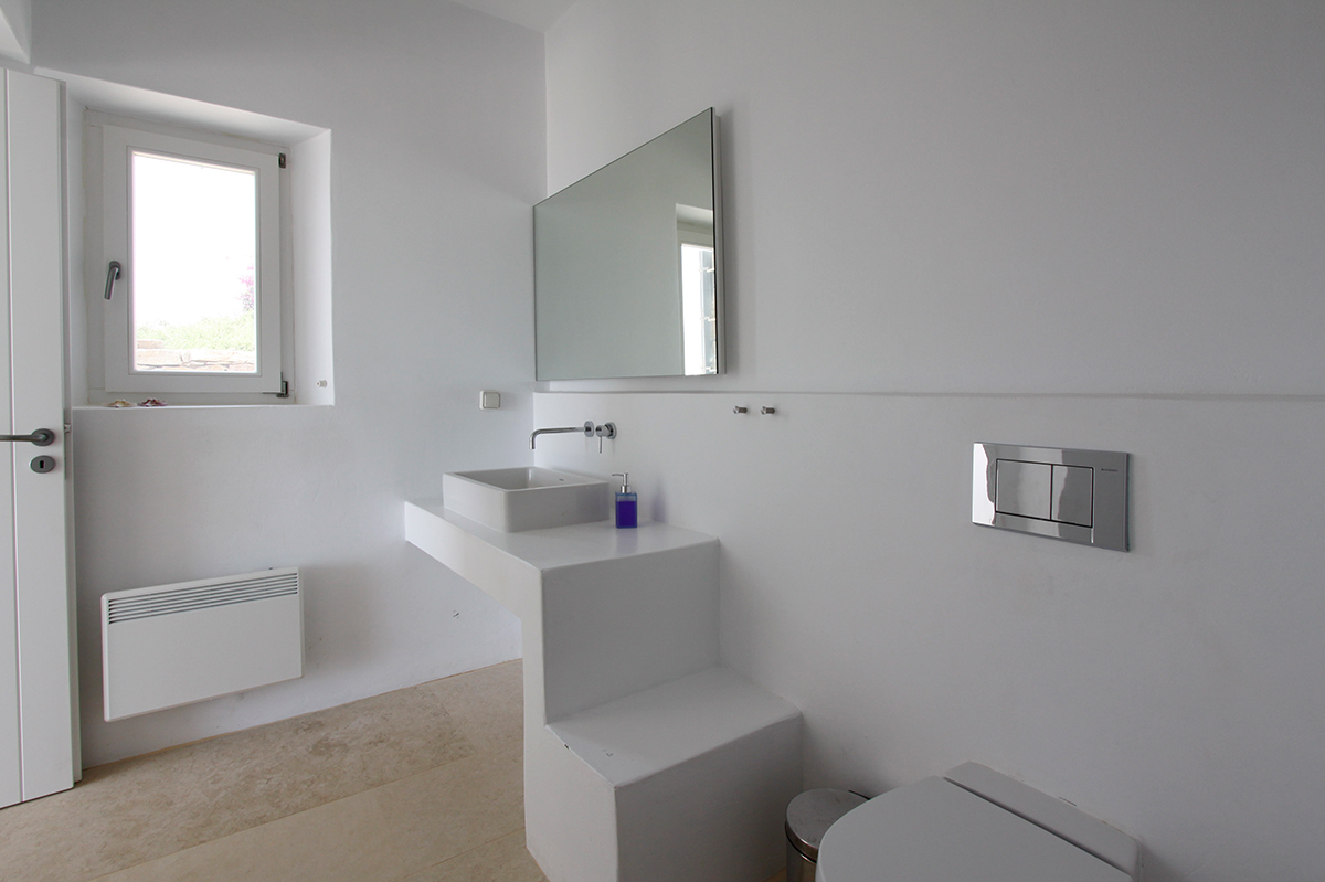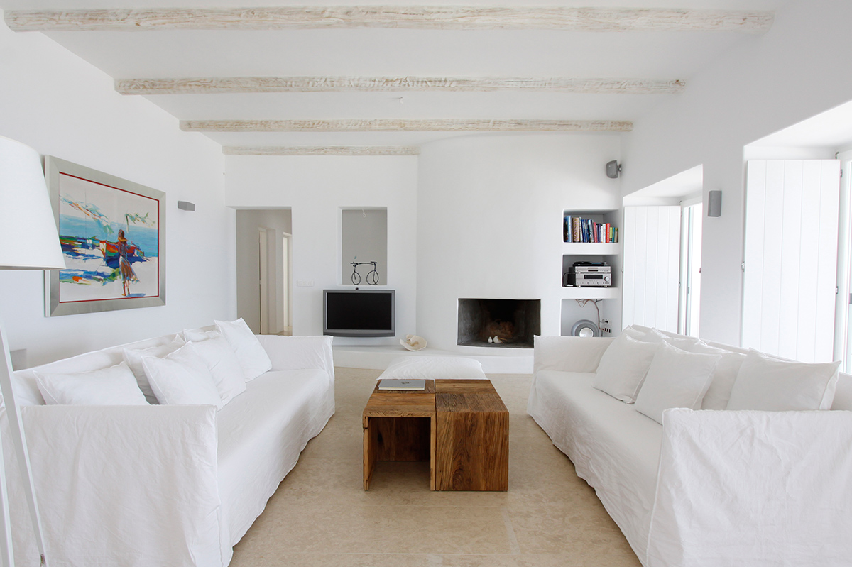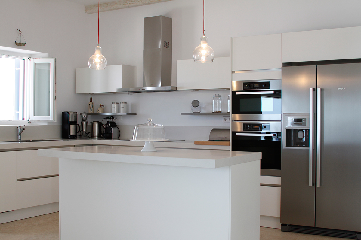 There is minimum usage of furniture and accessories, while great emphasis has been laid on spaciousness. The living room, kitchen and dining area are divided by high arches that add a geometric slant and optimize the illusion of openness. Orientated to offer views of the sea, the comfortable sofas and raw-wood coffee table are highlighted by the pale-colored polished stone floorings. The designer raw-wood dining table is served by a stylish kitchen that is fully equipped for home-cooking. In the same concept, the bedrooms are large and inviting, with designer furnishings and carefully selected upholstery aimed to pamper our senses and create an atmosphere of ultimate relaxation. All bedrooms lead to gorgeous verandas and offer stunning views of the settings. There are also two independent guest houses that are accordingly decorated and are ideal for couples or guests.