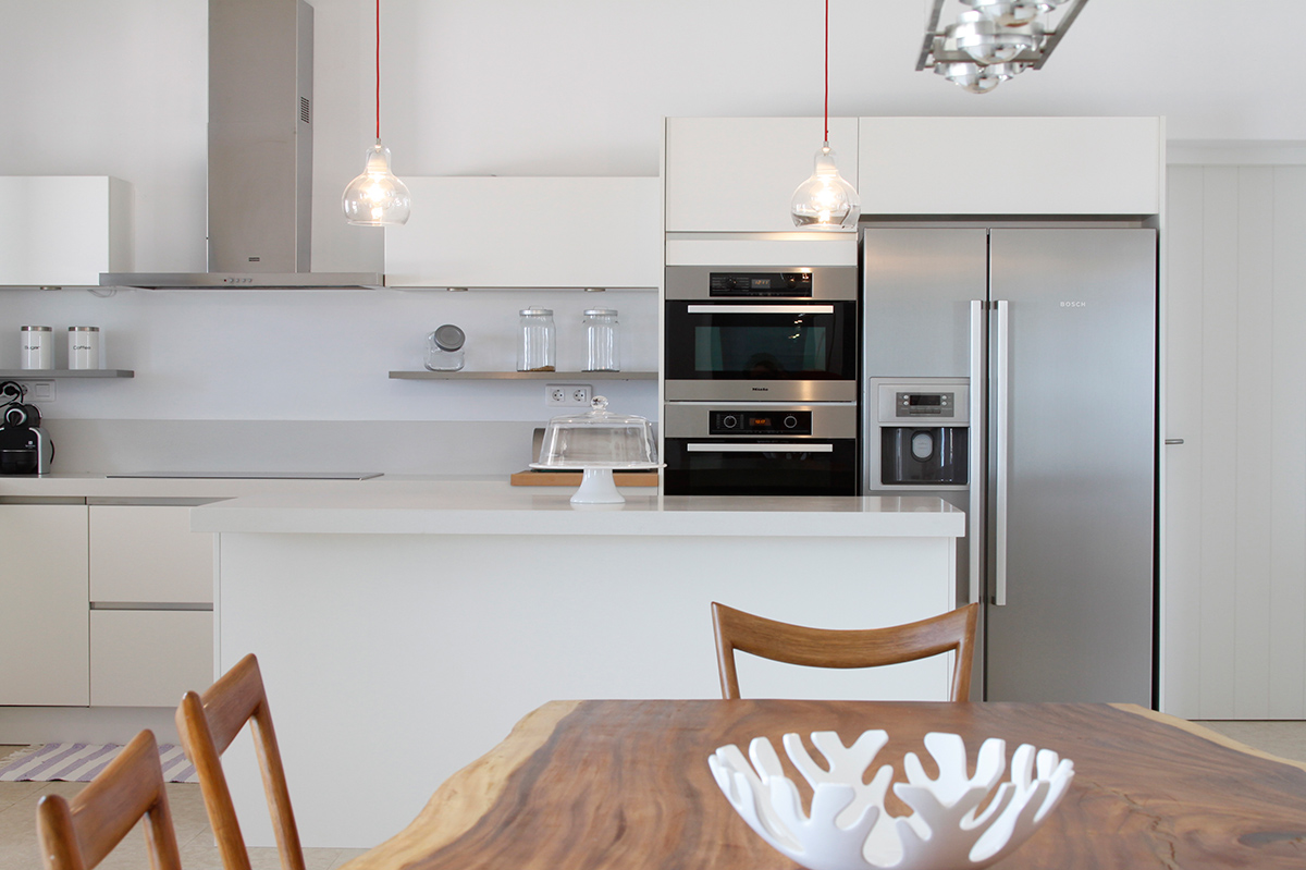The outdoor pergola-shaped dining and lounge areas are adjacent to an L-shaped infinity pool that blends in the seascape, creating the illusion of weightlessness. The interior is composed of minimal ornamentation and flat surfaces as dictated by the less-is-more philosophy of the Cycladic design. Minimal yet ultimately luxurious, the living areas feature large openings that offer stunning views of the landscape. Stark-white walls accentuate the cutting-edge Italian furniture and a few carefully selected art pieces that are casually placed throughout the house.