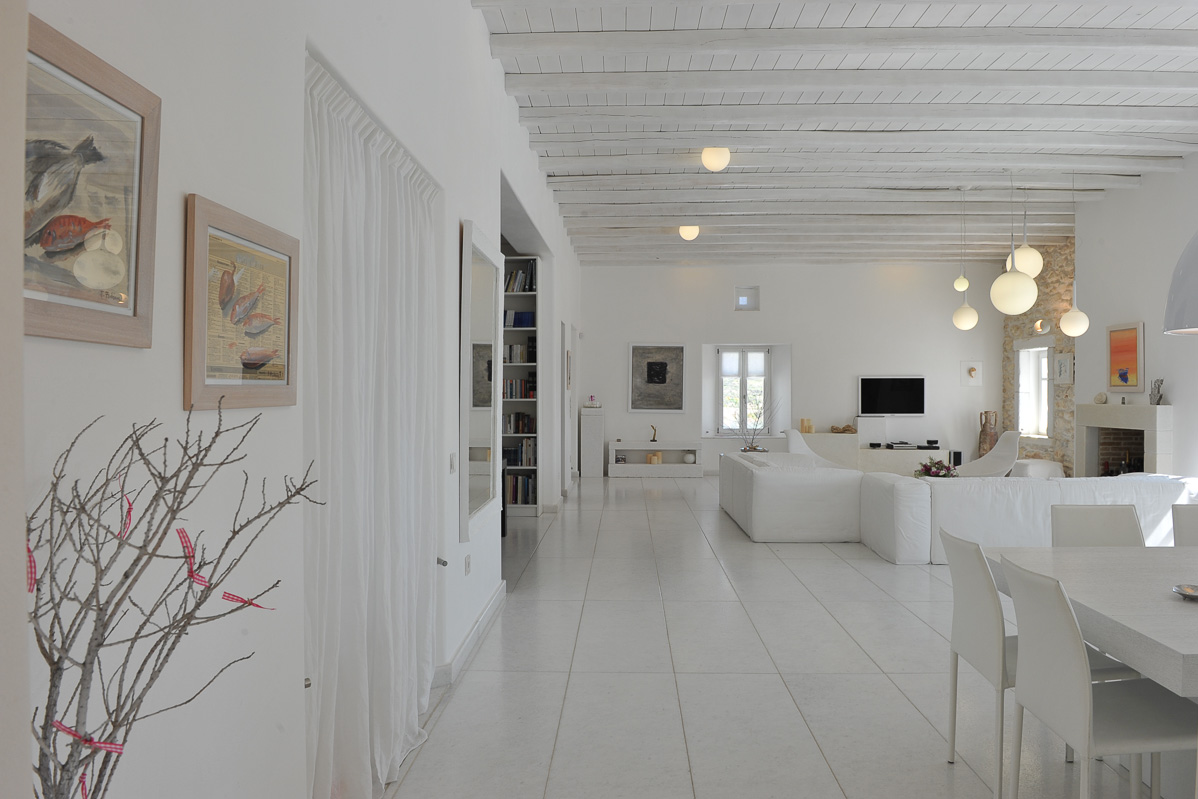 Your very own piece of paradise, four-bedroom Villa Lennox resides at the top of a hill offering enchanting vistas over the beaches of Paros and neighboring islands. A striking whitewash building, Villa Lennox contrasts remarkably with the azure sky above. Picturesque farming village Kostos is a short amble, less than half a kilometer, and Ysterni beach is a few minutes away by car.