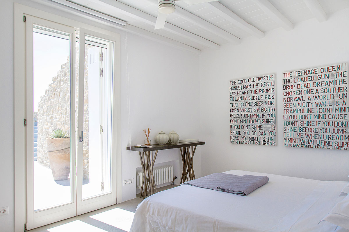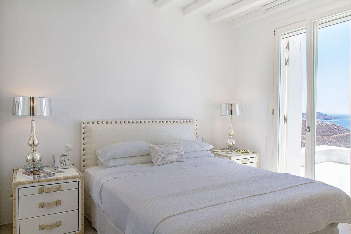 Cycladic architecture mixed with sleek modern design creates a traditional, yet luxurious, atmosphere inside Echo. White stone, wooden roofs, and an open-air environment are staples of the Greek style, as is the appreciation of the wondrous natural surroundings. You’ll find evidence of this throughout Echo’s entire property. The bright living room opens to the terrace on two of its walls, allowing seamless flow of guests and ocean breeze. The formal dining room, with seating for twelve, adds a sophisticated minimalism to the villa with its designer furnishings and carefully selected decor. The fully equipped kitchen is finished almost completely in clean white, with high end appliances and plenty of workspace. With so much functional free-flowing indoor/outdoor space, Echo is perfect for hosting an upscale dinner soiree.