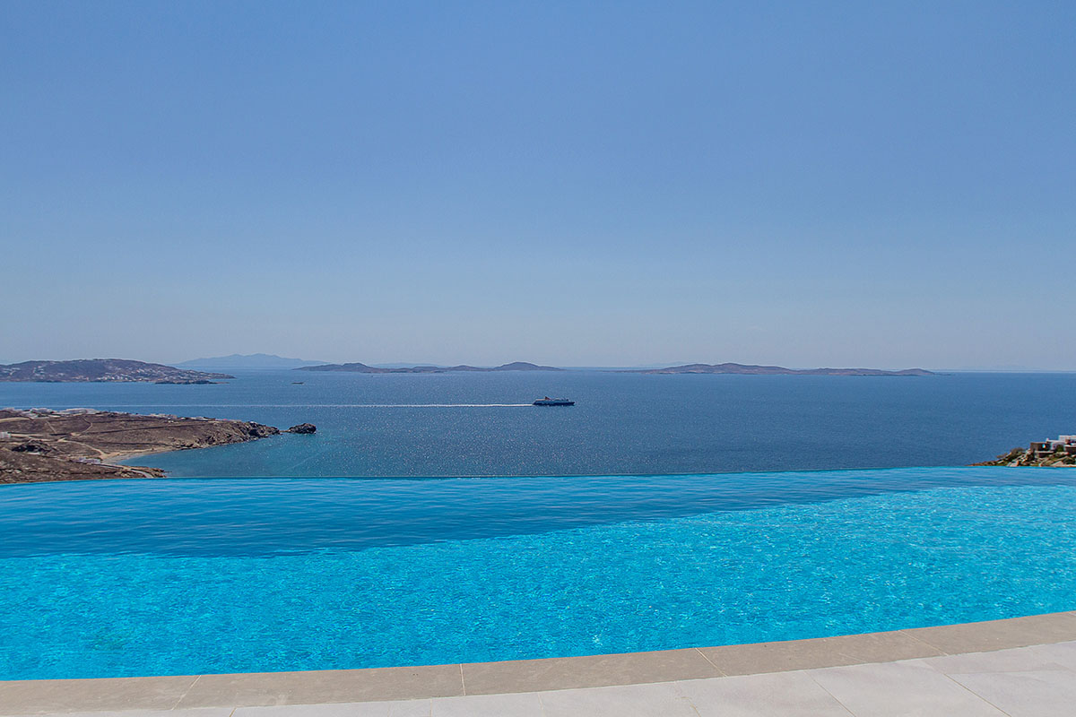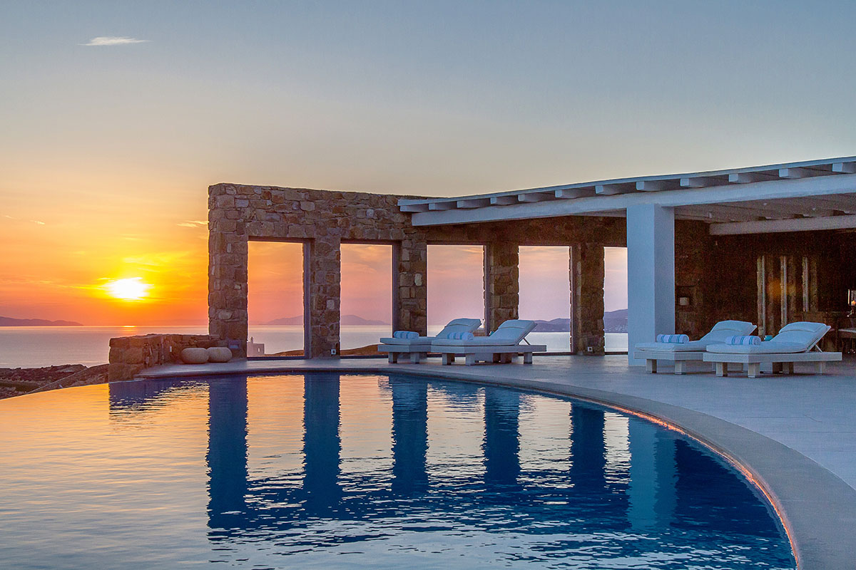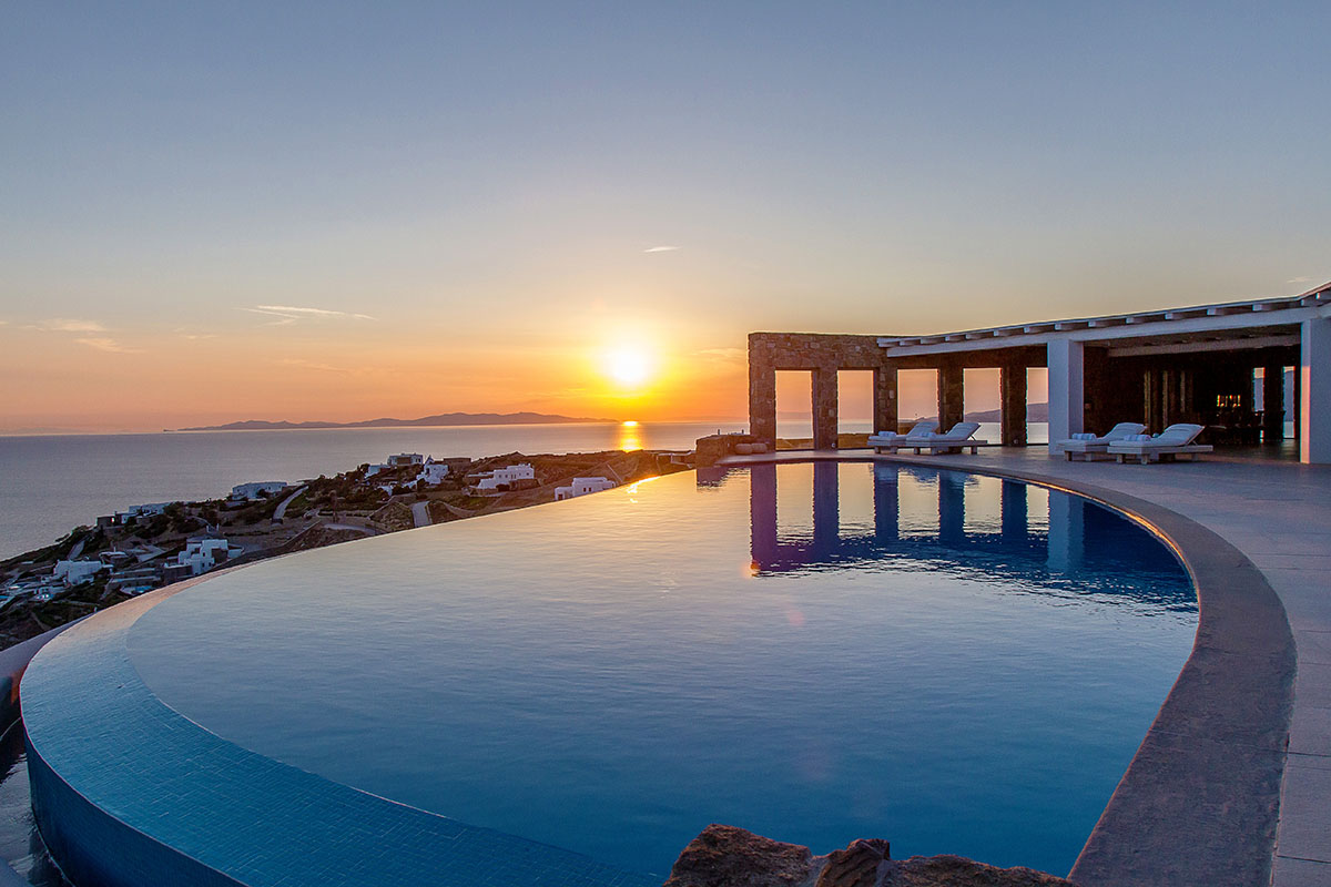 The luxurious Echo villa, just outside Mykonos, was created to capture the most amazing sunsets over the Aegean Sea. The semi-circular terrace is your front row seat to the most breathtaking show on the Island. With five elegant bedrooms, all with ensuite bathrooms and ocean views, Echo is perfect for an unforgettable Greek vacation with family and friends.