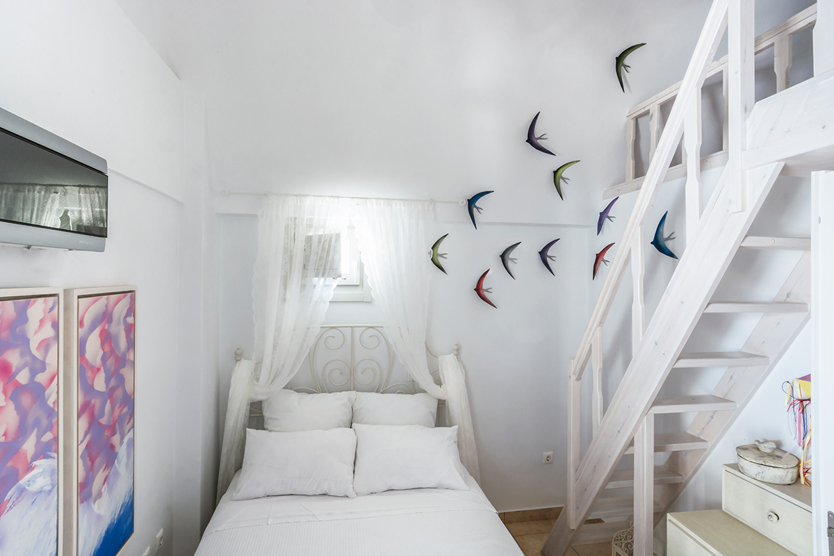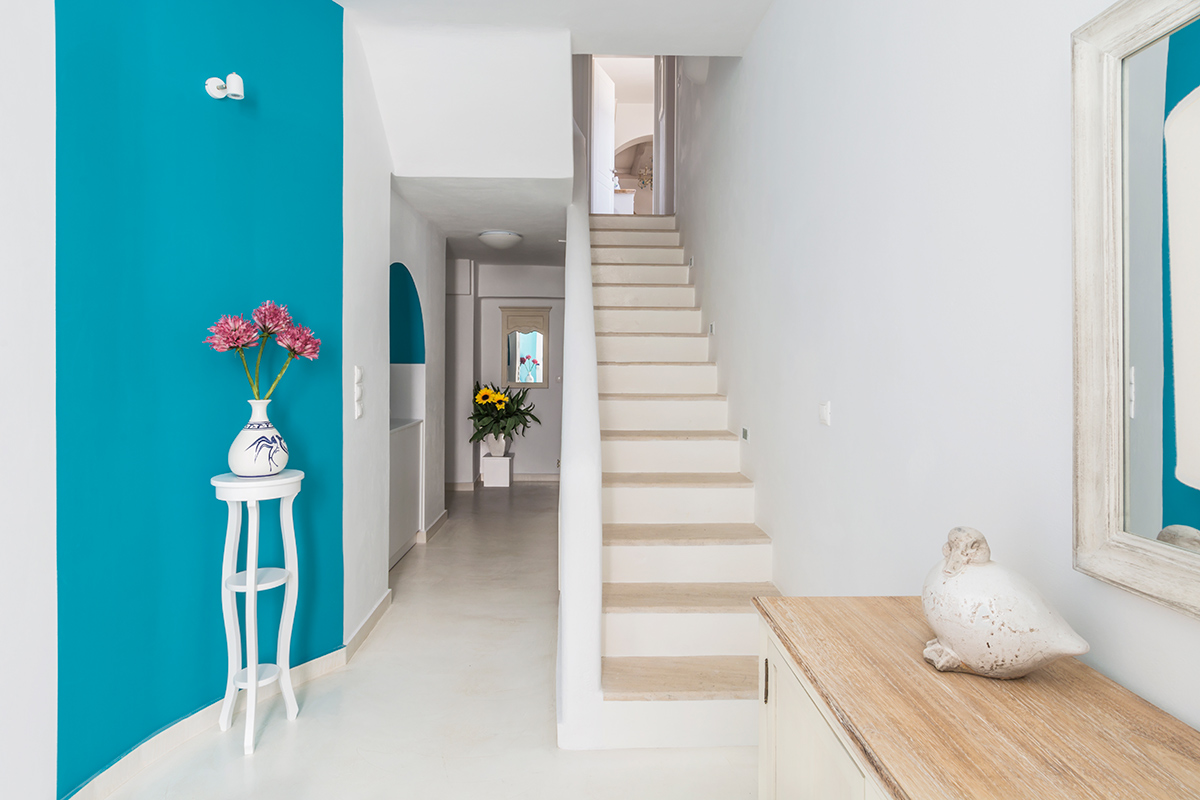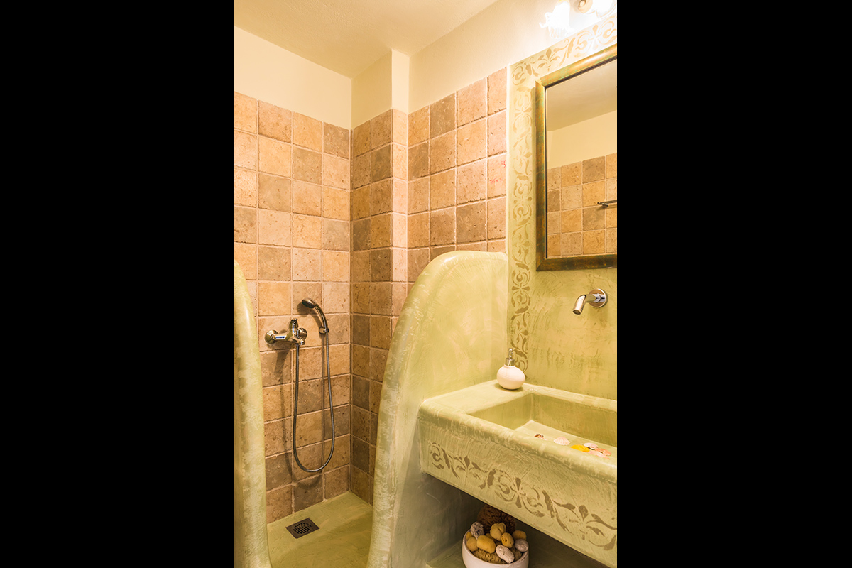Clustered around the central courtyard are the main living areas. As you step through the front door, the villa’s playful character reveals itself. Bright paintings, intriguing pieces of art and elegant furnishings are all offset by harmonious views. On the ground floor, you’ll find an inviting living/dining room stocked with digital home comforts and a fully-equipped country kitchen with walls painted by a famous Greek artist.