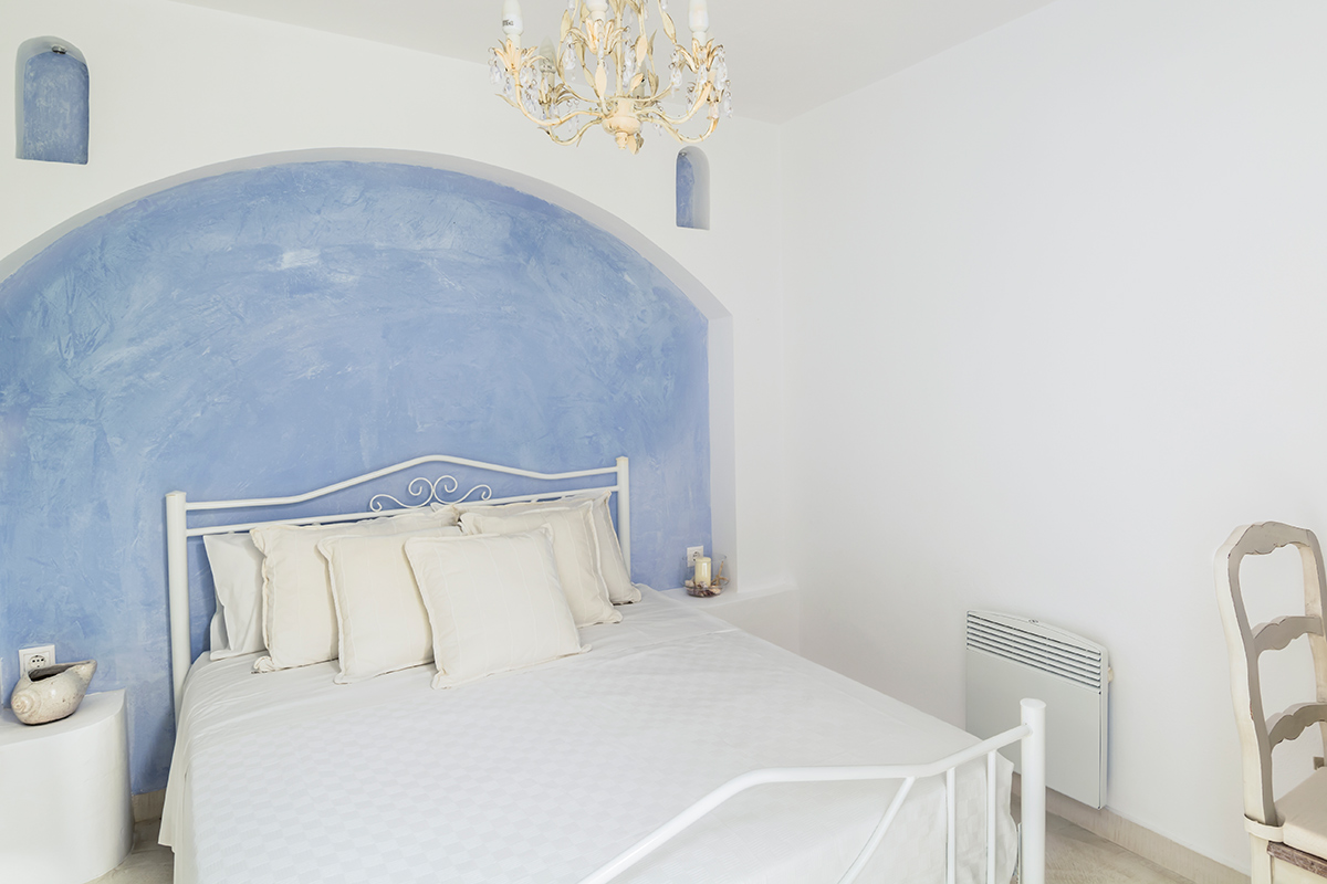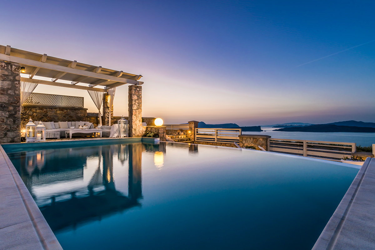 Although the inner rooms are extremely comfortable and a sanctuary to retreat to when the sun gets too hot, you’ll probably spend most of your time outdoors. The softly illuminated infinity pool extends a cool invitation any time of the day or night and there are various resting places from which to soak up the sunshine and beautiful views. An elegant lounge area, shaded by a pergola with fluttering white drapes, is a particularly atmospheric place to gather and chat by candlelight in the evenings. Stairs lead to another large terrace, the perfect spot to absorb unrivalled sea views. And if you love the tang of wood smoke, fire up the wood oven for a delicious family barbecue.