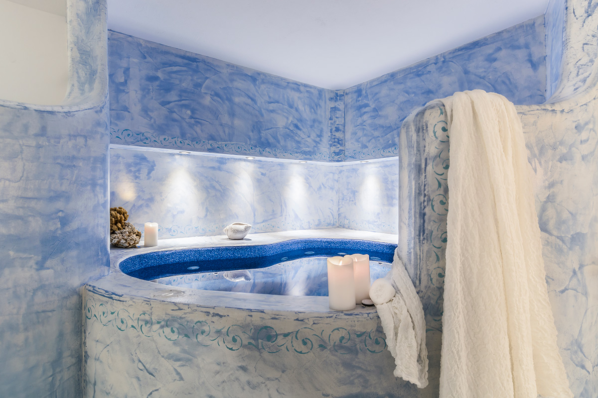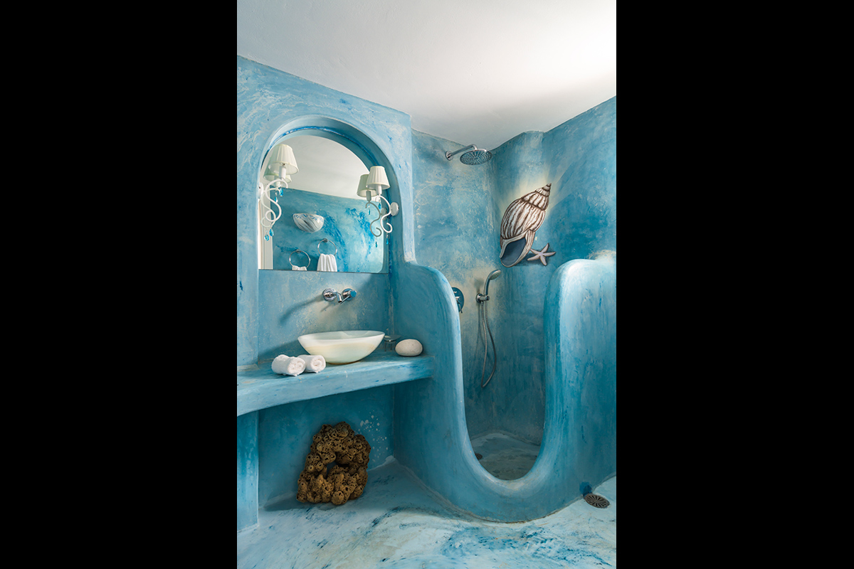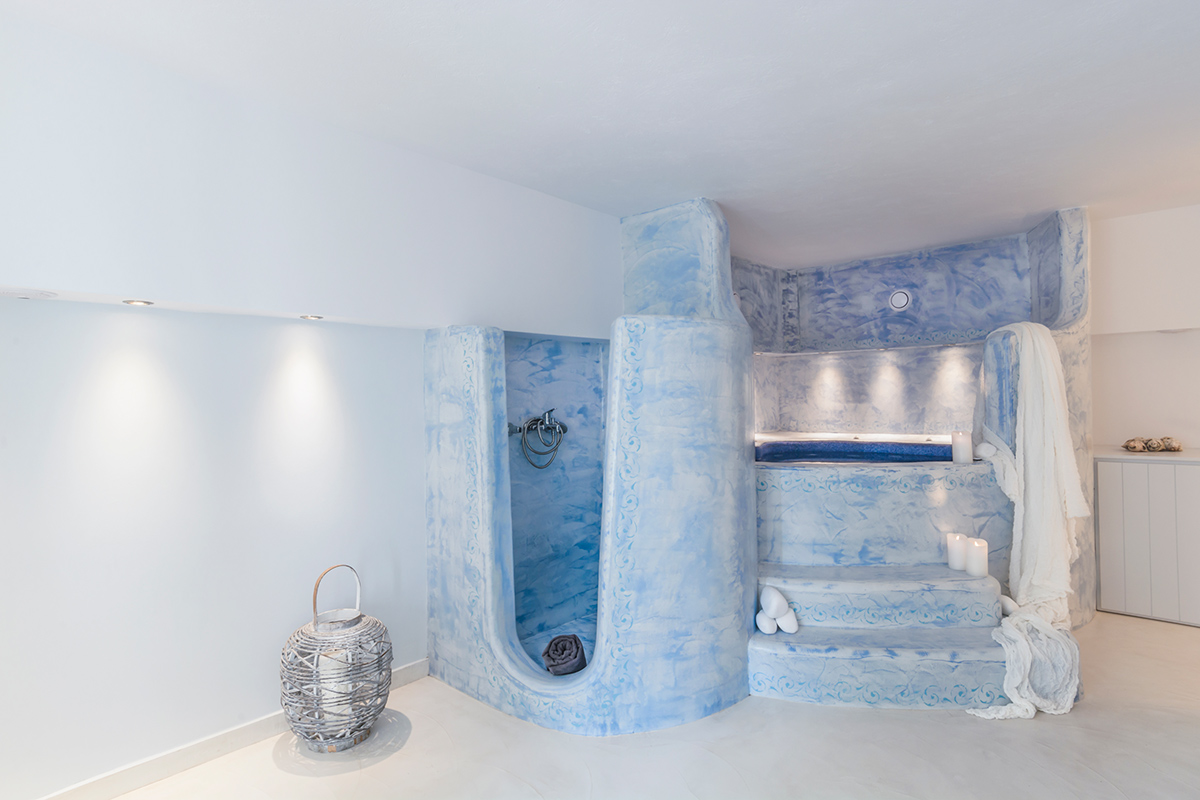 Five individually styled bedrooms wait to usher you into dreamland each night. The Lady’s bedroom, with its romantic setting, dressing area and adjoining red bathroom can be found on the ground floor. Upstairs, the elegant master bedroom boasts a dressing area, HDTV, a home theater, DVD player and relaxing sea views. It shares a blue bathroom with the double bedroom/mezzanine next door, which enjoys direct access to the terrace. The basement apartment receives natural light from the courtyard and benefits from a kitchen and living area. Bedroom five is also on the lower level, next to the spa room with Jacuzzi.