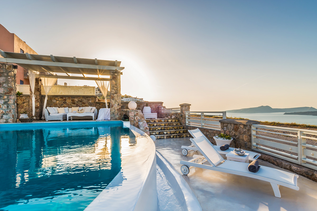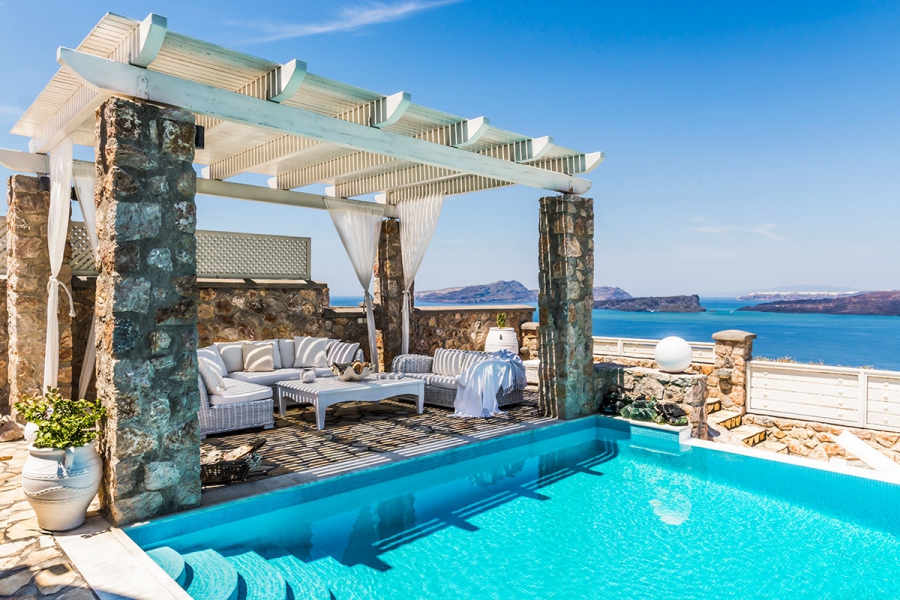 Commanding awesome views of the volcano and caldera from its majestic hilltop location, Michaela Residence is a peaceful 5-bedroom villa ideal for up to three couples or a family. The centerpiece of the villa is a private courtyard, which looks out to sea, and out at the back you’ll find an intimate alfresco dining area overlooking the old Castle of Akrotiri.