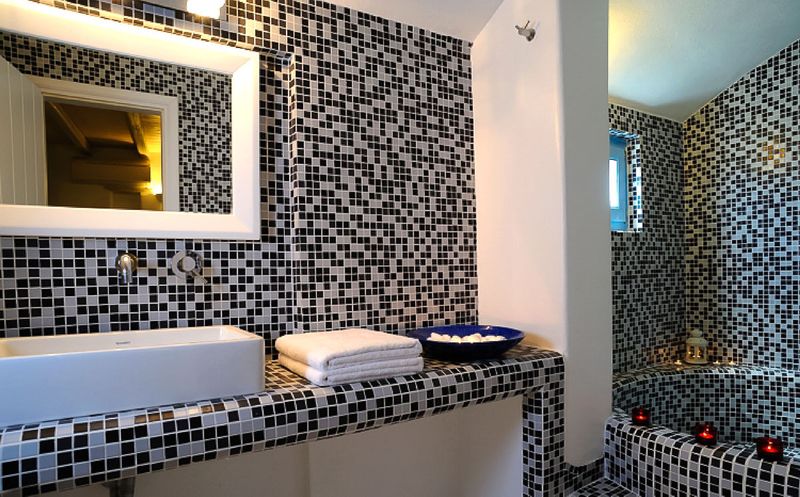 Three air-conditioned, simply furnished bedrooms are brightened by vibrant bedspreads and prints. Bedrooms one and two are both en-suite and are positioned on the ground floor with access to a private terrace, while a third bedroom occupies the loft. Mosaic-tiled modern bathrooms with tubs and showers complete the ensemble.