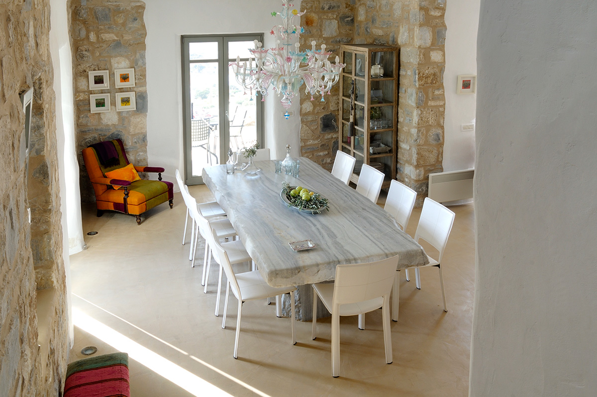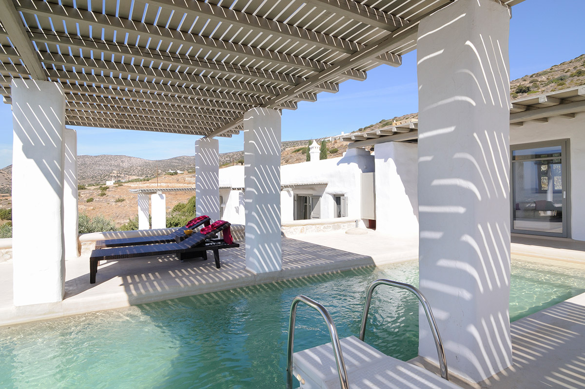 Brimming with personality, Villa Sullivan huddles into the Parian hillside, overlooking acres of bountiful olive yards. The villas’ enviable position offers views across a landscape dotted with pretty whitewash houses and out to sea, where you will find the island’s miniature neighbor, Antiparos. Just 1km from the villa lies popular Farangas beach. Venture just a little further for quaint fishing villages Ageria and Aliki.
