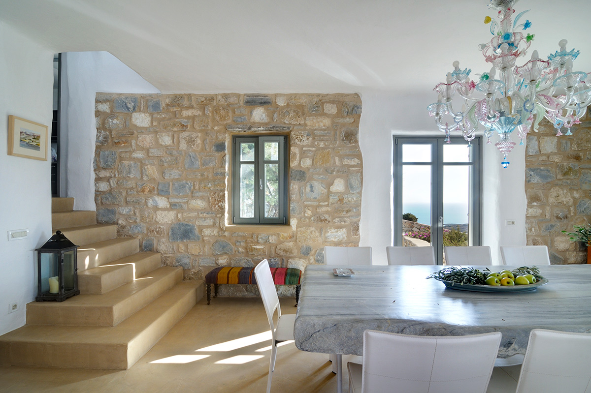 A delightful blend of traditional Cycladian architecture and uplifting colorful accents, the living room is an upbeat space, rich in character. Enjoy group meals under the pastel shades of the chandelier, and make a toast to your dream vacation. Connecting the villa’s two wings is a long window fronted corridor, a soothing spot to curl up with a book. The kitchen emanates a sophisticated image, with sleek black units, making your meal preparation a pleasure. There is also the option to pre-arrange your own private cook.