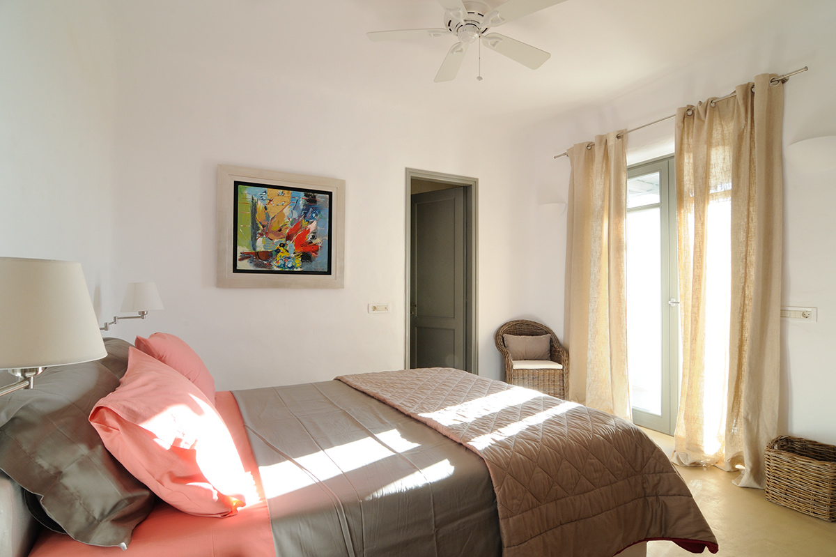 Bedroom 1:Double size bed, En-suite bathroom with shower, Ceiling fan, Access to terrace, Sea view