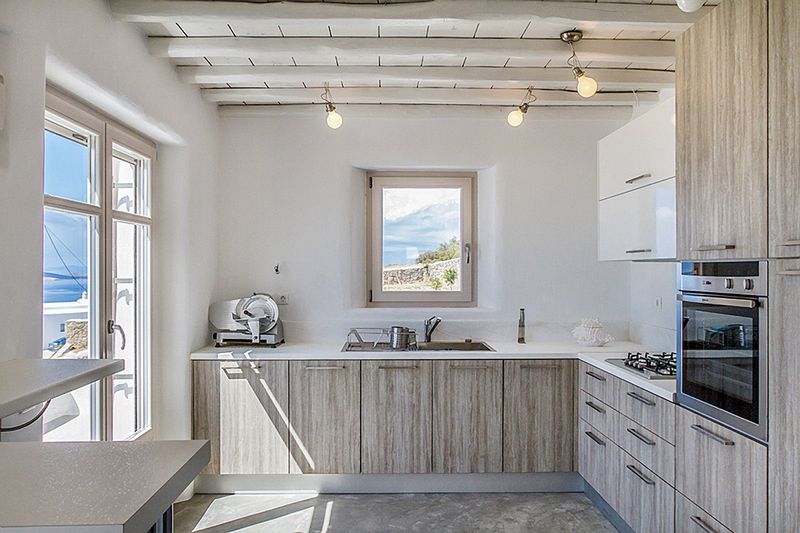 Large windows, an all-white color scheme and an open layout let the Mykonian sunshine bounce around the villa’s living and dining rooms. Stretch out on one of the white sofas around the sleek glass-topped coffee table to watch TV, cozy up to the fireplace or read a selection from the open bookshelves. Meals take on an easy, casual feel in the white canvas-covered dining chairs. The fully equipped kitchen has the same fresh white color scheme and a playfully curved layout.
