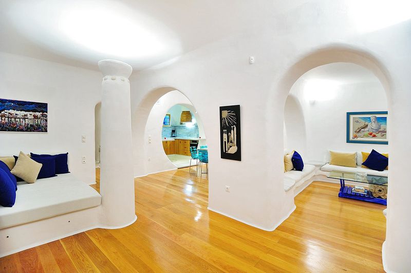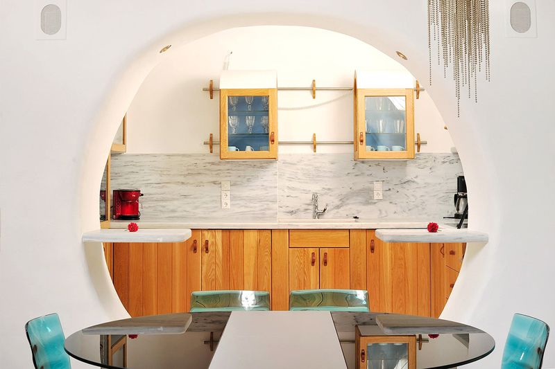 The indoor spaces showcase a unique design style with arches that follow one another, where tradition is met by a contemporary approach and modern comforts are available without compromising the overall romantic theme. The full enjoyment of the view is also a main focus of the architecture, evident with the clever use of glass surfaces throughout the living areas and most of the bedrooms. Cool white spaces provide that quintessential Mykonos vibration.