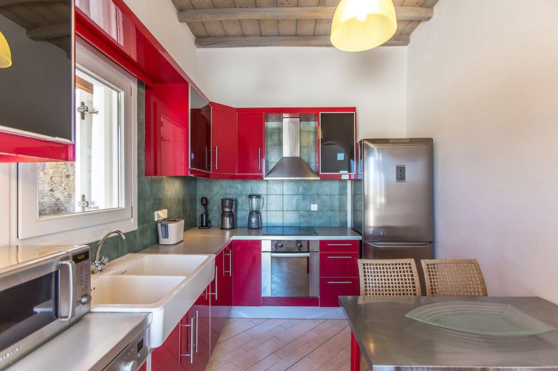 The villa’s cool white interiors pair traditional architecture with modern furnishings. Though the living room has fresh white walls, a wood-beamed ceiling and a stone fireplace, it’s filled with a sleek black leather sofas and contemporary accent chairs. The adjacent dining area seats eight at an unusual octagonal table in casual director’s chairs. You’ll find a pop of color in the fully equipped kitchen, though; its red cabinets and green tile backsplash make it bright and cheerful.