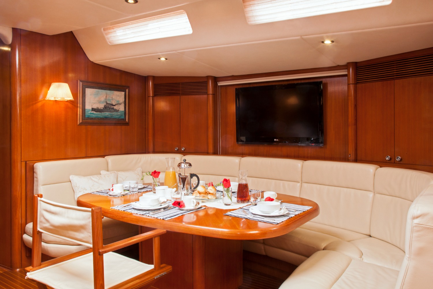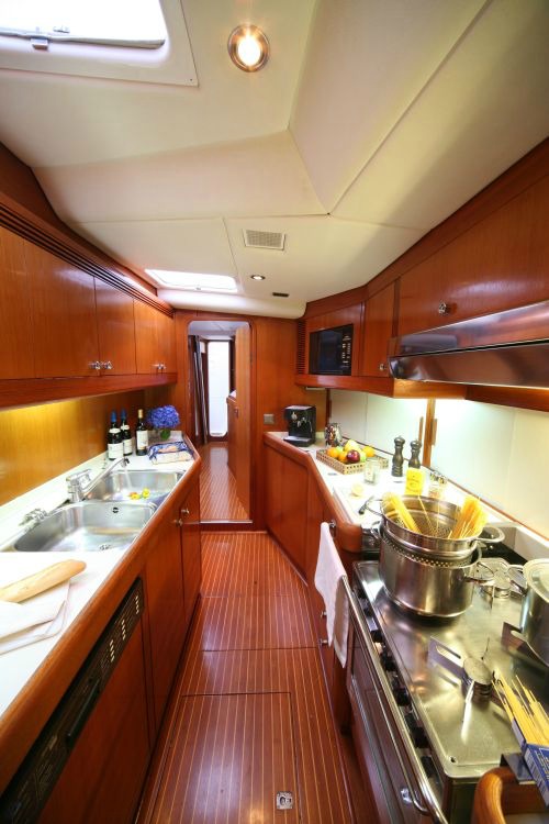| Deck & Cockpit equipment | Anchor windlass electric , Main anchor-chain , Fenders , Hand bilge pump and handle , Gangway , Electric gangway , Swimming ladder , Door panels-keys , Boat hook , Winch handles , Dinghy, pump, oars , Outboard motor , Plastic bucket , Water Jerrycan , Diesel jerrycan , Engine oil , Fuel funnel , Deckbrush , Gas bottles , Spare Anchor , Mooring lines , Teak Deck , Cockpit table |